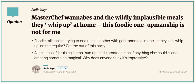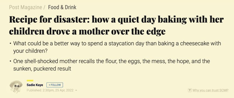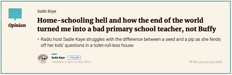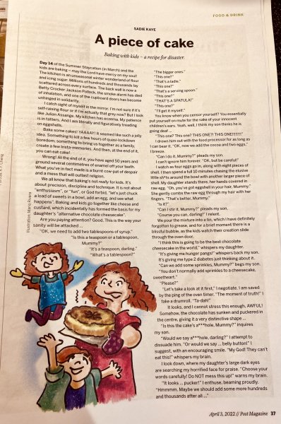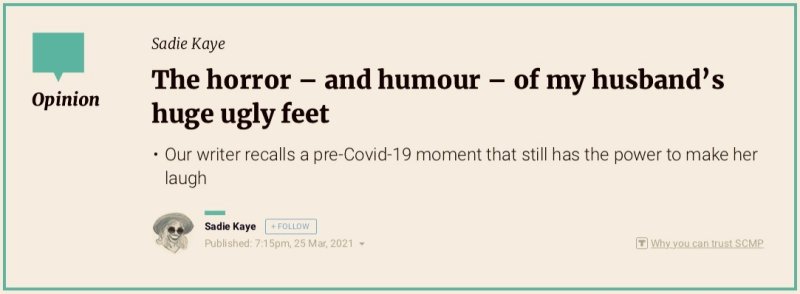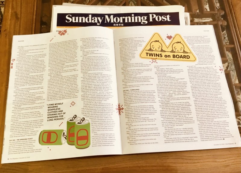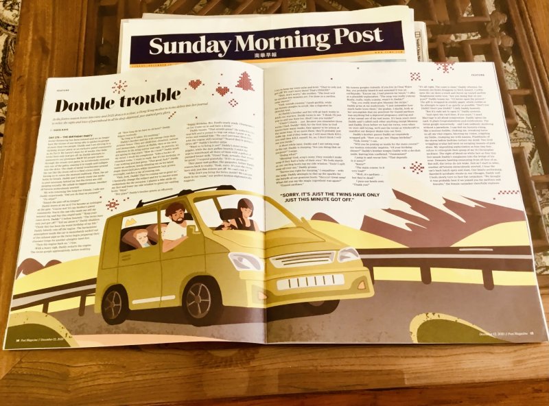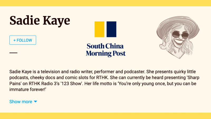 From 2019-2021 she wrote a column as RTHK‘s ‘Miss Adventure‘ for HK Buzz. Her monthly humour column for RTHK Radio 3, Sharp Pains, spawned some goofy columns in the South China Morning Post. Her ‘3 terrifying short stories‘ were published in the festive edition of Post Mag 2021. In 2023 Sharp Pains was long-listed for Helen Lederer‘s Comedy Women in Print Prize. In Dec 2024 she won the Comedy Women in Print Prize for flash fiction. Her humour column Flush Fiction was published by The Hooghly Review Feb 2026. Her columns The Snide Sniper and Unflushed Fiction were published in March and April 2026.