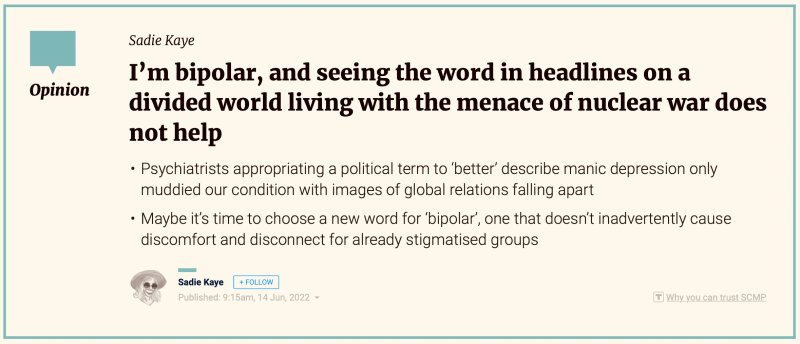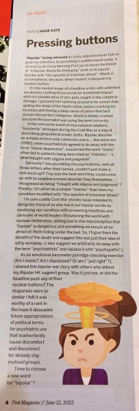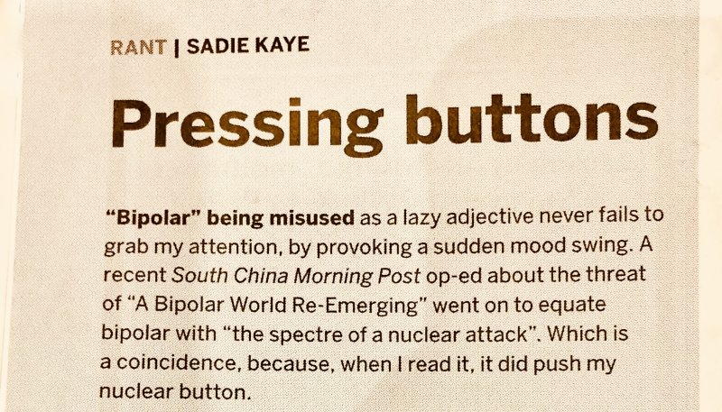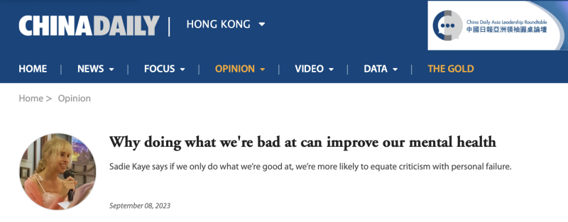 Her ‘rant‘ on having a mental health condition that’s muddied with the spectre of nuclear attack was published by the SCMP in 2022. Her article on the mental health benefits of doing what she’s bad at was published by the China Daily in 2023. Her articles about changing the lexicon of mental health and the effect of climate change on mood were published by the China Daily in 2024. Her latest article on narcissism was published in Sept 2025.