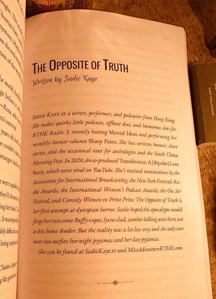 Sadie’s first foray into children’s stories was The Wishing Machine, a whimsical tale of two kids and a magic washing machine. She’s an active member of SCBWI, the Women in Publishing Society and the Hong Kong Writers Circle. Her short story Shitstorm was published in the Hong Kong Writers Circle‘s anthology After the Storm and launched at the 2021 Hong Kong International Literary Festival. Her short story Toot was published HKWC anthology A Book of Changes in 2022. Her dystopian short story The Opposite of Truth was placed a runner up in Post-Apocalyptic Media‘s 2022 Short Story Contest and published in anthology Through the Remains in 2023. Her dog’s Foodie Poo Review (!) was published by Cha April 2026. It was Cha‘s #2 Most Read column that week.